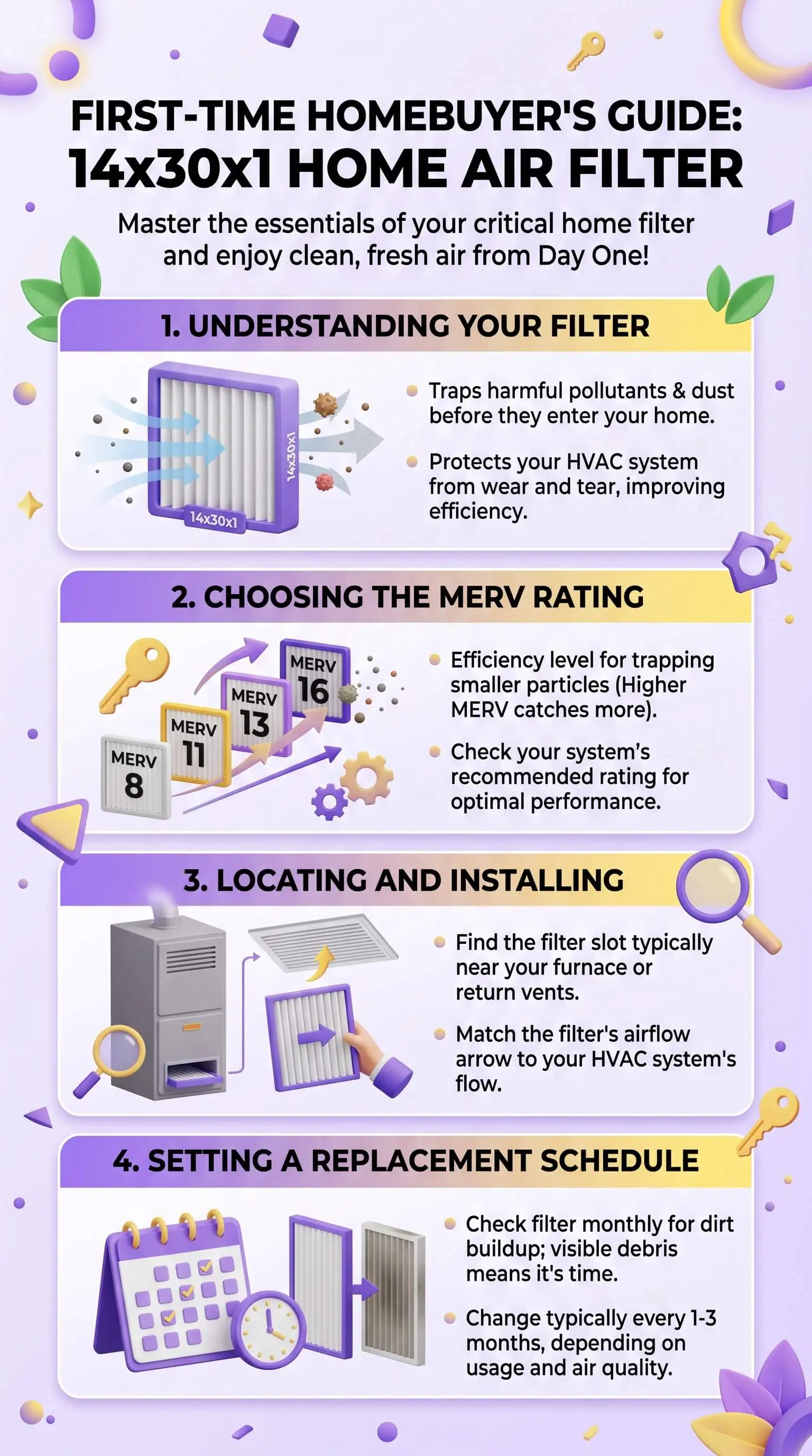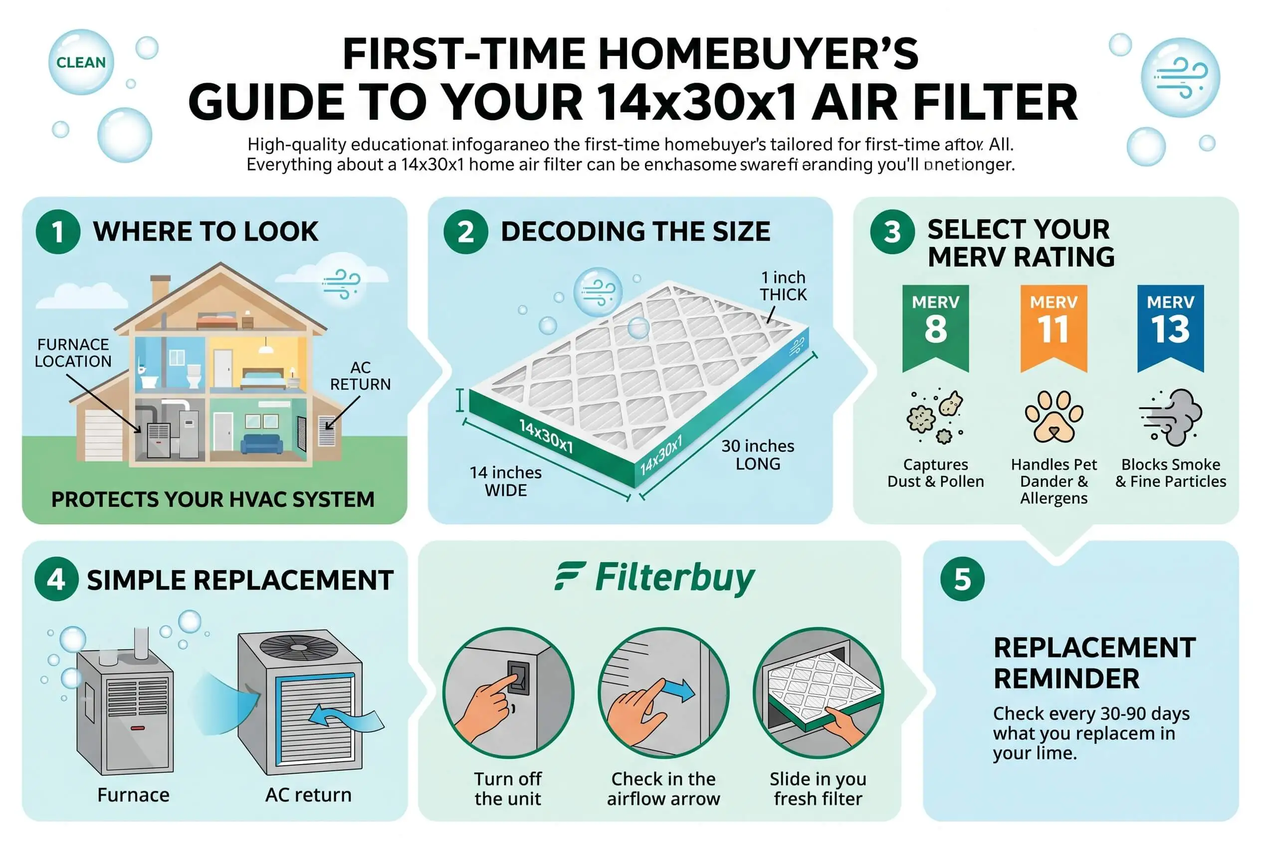 Pull the old filter out of the return grille today and read the size on the frame. If it says 14x30x1, you already know what to buy. Pick a MERV rating that matches your household, order two at once so the spare waits in the closet when the reminder fires, and write the install date on the frame in marker. That protects the most expensive HVAC equipment in the house, trims your monthly utility bill, and gives your family cleaner air for the next two months. Welcome home.